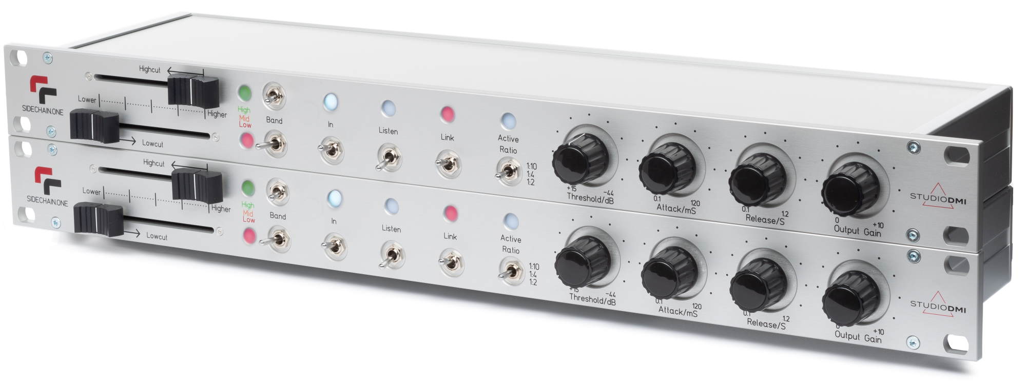 for shaping sound. Use sidechain.one in mono on individual tracks or in stereo on the 2-Bus for mixing or mastering. The focus of this unit is on the high-pass and the low-pass filters for the sidechain. The filters range from 20Hz - 200Hz, 150Hz - 2.3kHz, and 1.5kHz - 20kHz, respectively. The Listen feature lets you listen to what the side chain is receiving and can be used as a high quality band-pass filter. The compressor ratios are 1:2 (soft), 1:4 (medium) and 1:10 (hard), attack times range from 0.1ms to 120ms and release times range from 0.1ms to 1.2s.