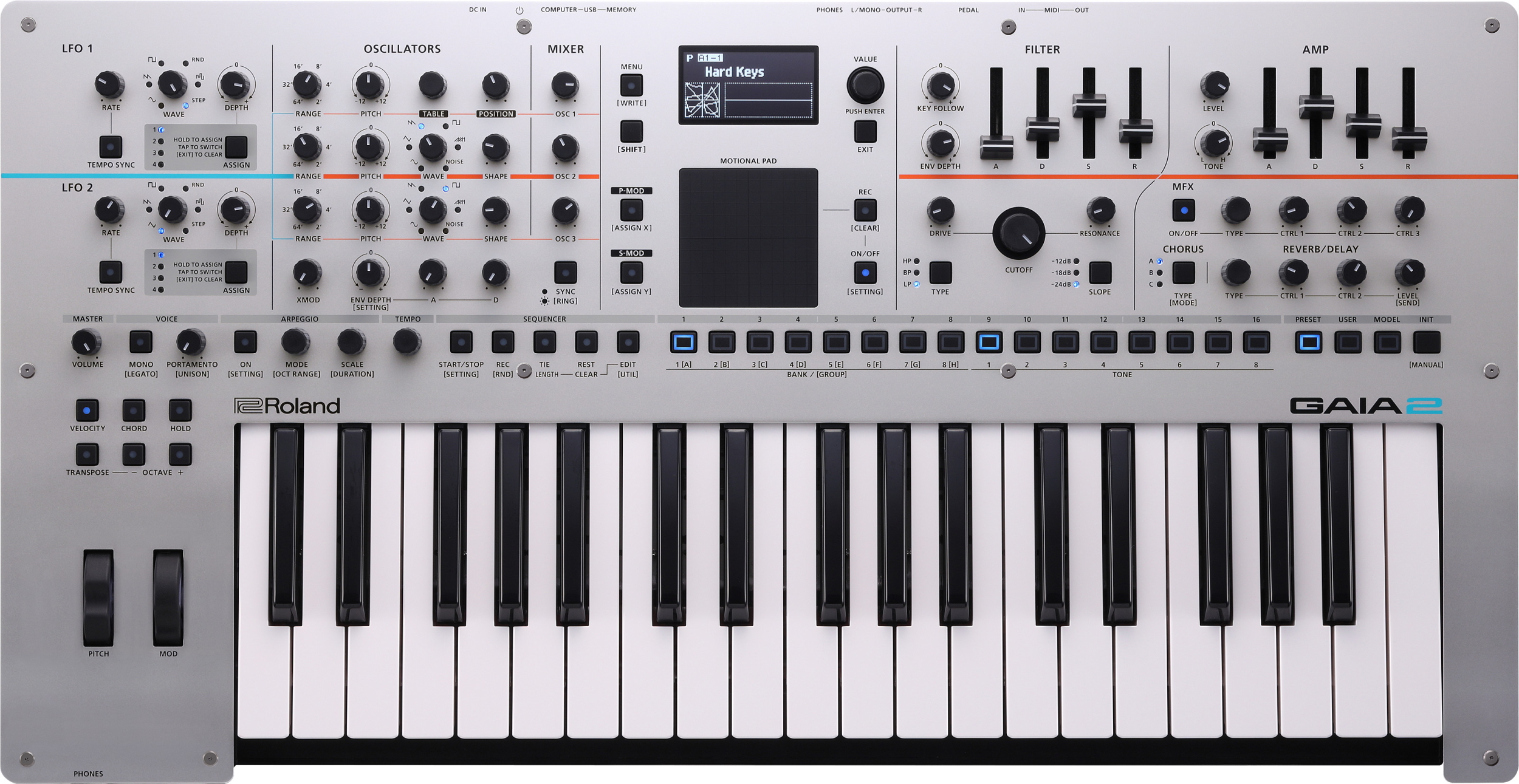 Roland announces GAIA 2, an advanced synthesizer with a newly developed hybrid sound engine and a friendly panel layout that makes learning synthesis and exploring sound design easy and fun. Equipped with wavetable and virtual analog oscillators, interactive controls, 37 full-size keys, Model Expansion support, and other powerful features, GAIA 2 opens the door to an infinite universe of inspired creation.