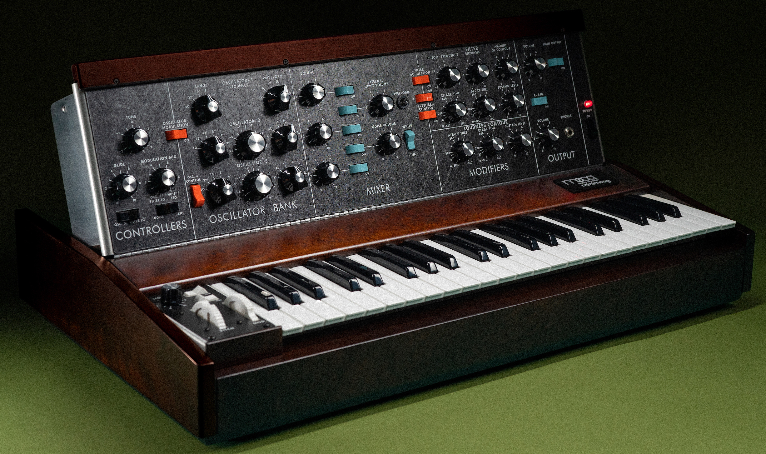 The three-oscillator, monophonic, analog synthesizer is securely housed in a locally sourced Appalachian cherry cabinet with a legacy-inspired walnut stain and hand-finished aluminum chassis. Sounding as vibrant and deep as ever, its legendary low-pass ladder filter, powerful oscillators, and rich saturating mixer retain the exact component placement and through-hole design of a 1970s-era Minimoog Model D.