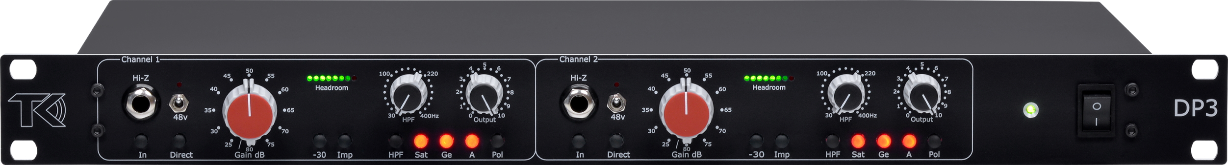 TK Audio presents the DP3, a unique hybrid design including both vintage and modern circuits. The midrange crunch of the germanium sound of the mid 60’s, the low mid punch and thick sound associated with British class-A from the early 70’s as well as the more modern tone from the 90’s. DP3 contains not just our well proven input stage and germanium circuit, we have also incorporated a new saturation circuit that together with the vintage class-A stage gives you lots of character choices. The input stage is designed around a high quality Swedish Lundahl transformer and a gain stage with up to 80dB of gain followed by selectable saturation and germanium circuits for more color and harmonics.
