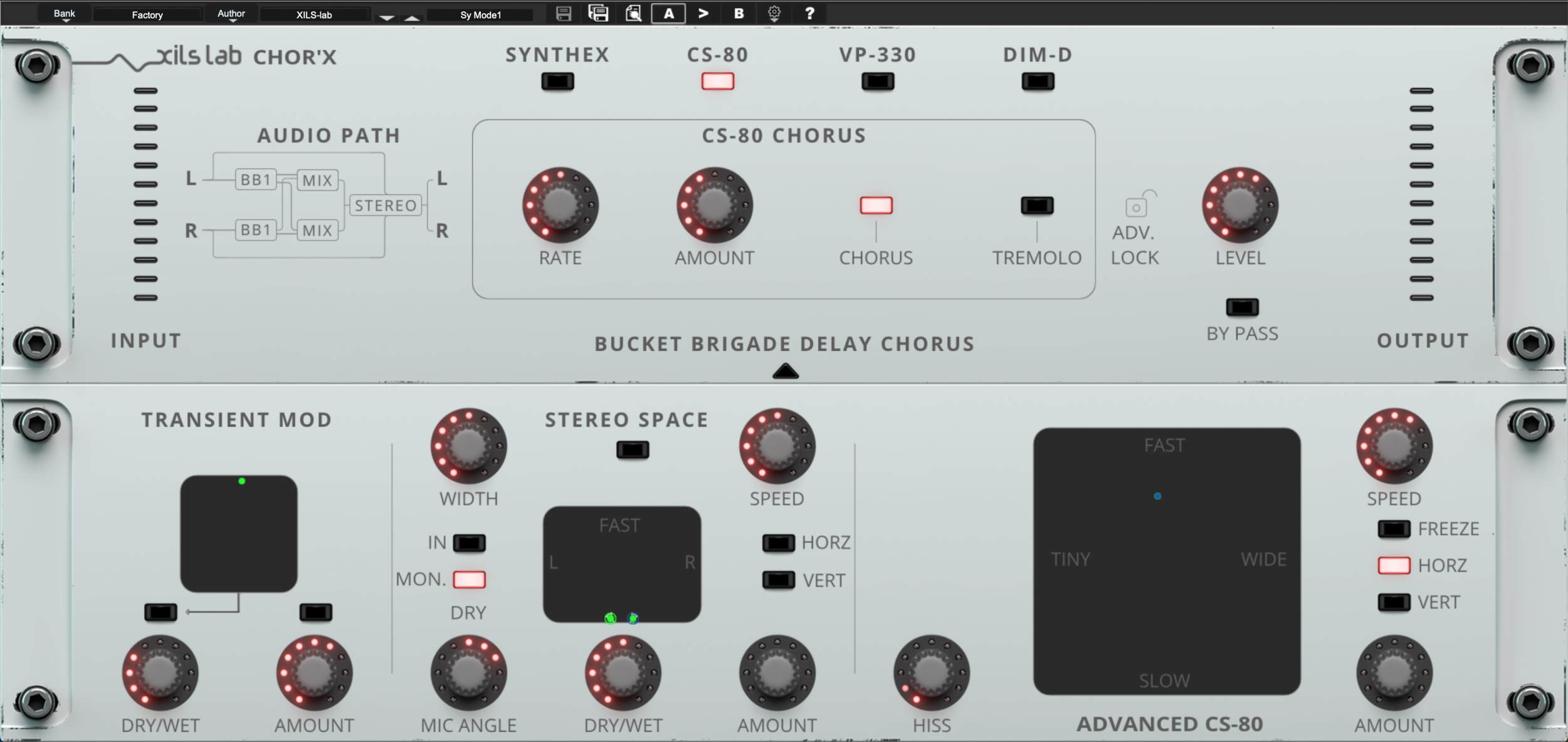 That timely introduction of an all-new GUI makes Chor’X 2.0’s raison d’être perfectly clear for all to see and, ultimately, hear by putting its four standard chorus structures - SYNTHEX, based on two BBDs (Bucket Brigade Delays) and two LFOs (Low Frequency Oscillators) per channel, plus an amplifier-based compander (compressor-expander) emulation; CS-80, based on one BBD and two LFOs per channel with the LFOs also modulating the level; VP-330, based on two BBDs and two LFOs per channel, plus an amplifier-based compander emulation; and DIM-D, based on one BBD per channel and only one LFO dispatched in inverted phase to the left and the right channel - in plain sight. Simply click on the corresponding button to choose the desired chorus structure shaped with special filters and compander emulations to get as close as possible to the Seventies- and Eighties-vintage original older analogue chorus units respectively residing within two classic analogue polysynths, a vocoder/string synthesizer keyboard, and a rack-mounting processing predecessor to a legendary (later-released) guitar pedal - all heard on countless classic records in all genres, and still sought after today.
