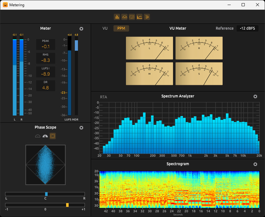 The separate window with all the level meters and spectrograms, phase scope, etc. (see illustration above) can now be adapted by the user according to their needs.
