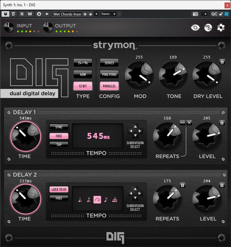 Letˊs start with the DIG Dual Digital Delay. As the pedal model is designed in pink, the GUI can be switched between pink and black. The user interface includes everything the hardware pedal offers (six encoders and four switches), but there are additional settings.