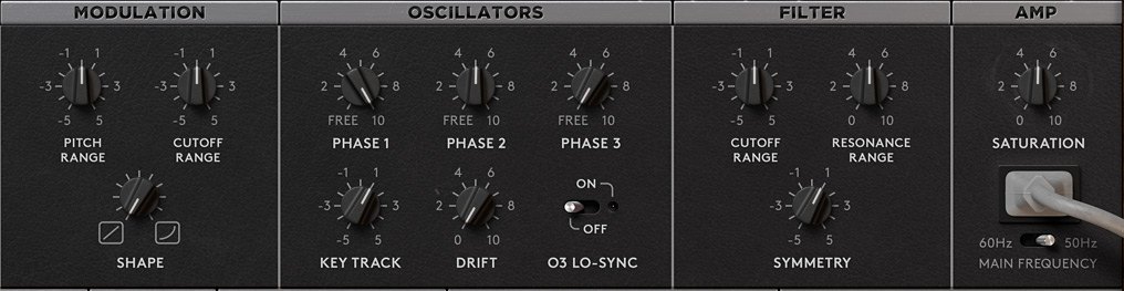 In the OSCILLATORS section, the phase start point can be set from a free to a fixed adjustable value. In FILTER, the user can set the cut-off frequency, resonance point, and filter symmetry, which can be used to continuously adjust the nonharmonic content of the upper frequency waves. Finally, the AMP section offers an adjustable saturation level.