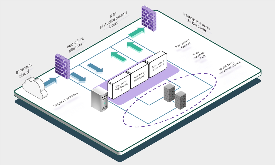 Insgesamt laufen bei ihnen zwei aixtream-Systeme - ein Haupt und ein Backup-System. Beide laufen virtualisiert auf XenServer-Maschinen. Diese Systeme nutzen Cloud- sowie AES67-Playout-Sources und verarbeiten diese in 14 Opus-codierte RTP-Streams, welche dann in das interne Netz von ams übermittelt werden, wo sie dann decodiert werden. Teil dieses Workflows ist ein völlig redundantes Setup. Beide aixtream-Systeme sind komplett gespiegelt und übermitteln zwei vollständig redundante Streams. Virtualisierte Installationen auf existierenden XenServern sorgen dafür, dass die Implementierung einfach blieb. Zusätzliche Hardware hätte die Komplexität des Netzwerks unnötig erhöht.
