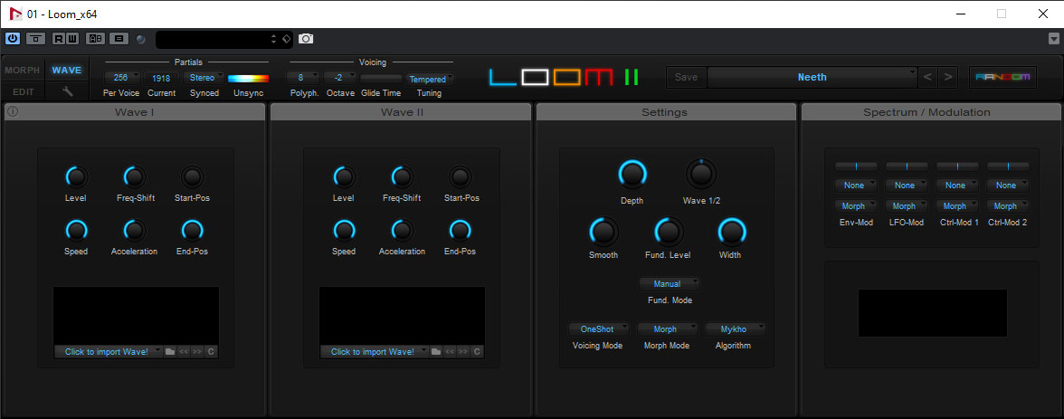 Neu ist bei Loom II gegenüber der ersten Version ist auch die Sektion "Wave" (s. Abb. oben). Hiermit lassen sich für beide Oszillatoren Wave-Dateien laden, die die Partiellen beeinflussen, bzw. wird deren Charakter aufgeprägt. Das Ganze funktioniert und klingt auch so ähnlich wie ein Vocoder. Es lassen sich im Setting-Fenster noch die Effekttiefe etc. und in einer vierten Sektion ganz rechts noch Modulationsparameter einstellen.