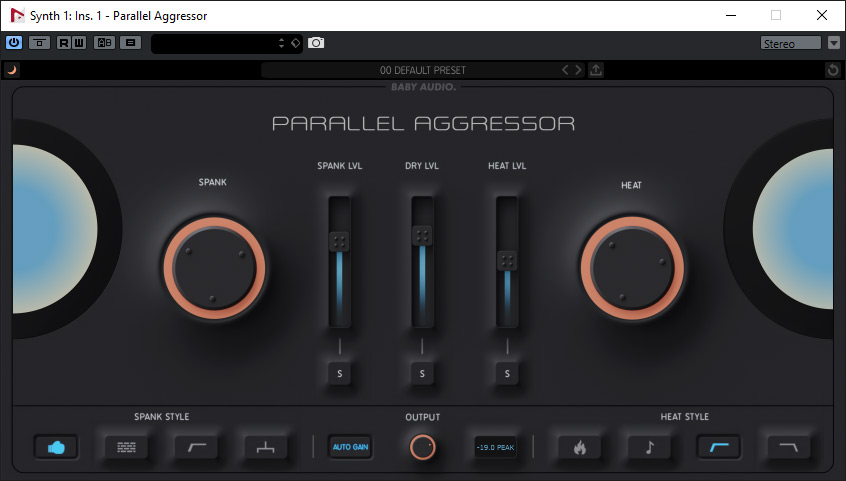 Was macht denn eigentlich der Parallel Aggressor? Wir haben ja schon auf die Gemeinsamkeit mit dem "I Heard NY" Plug-In hingewiesen. Im Gegensatz dazu gibt es aber nicht nur zwei sondern drei parallele Audio-Bearbeitungspfade und zwar das Originalsignal, den SPANK-Pfad mit einer starken Komprimierung und den HEAT-Pfad in dem das Signal über eine simulierte Bandsättigung angezerrt wird. Alle drei Wege lassen sich im Ausgangspegel justieren. Eine Audiobearbeitung findet also in den zwei Pfaden SPANK und HEAT statt.