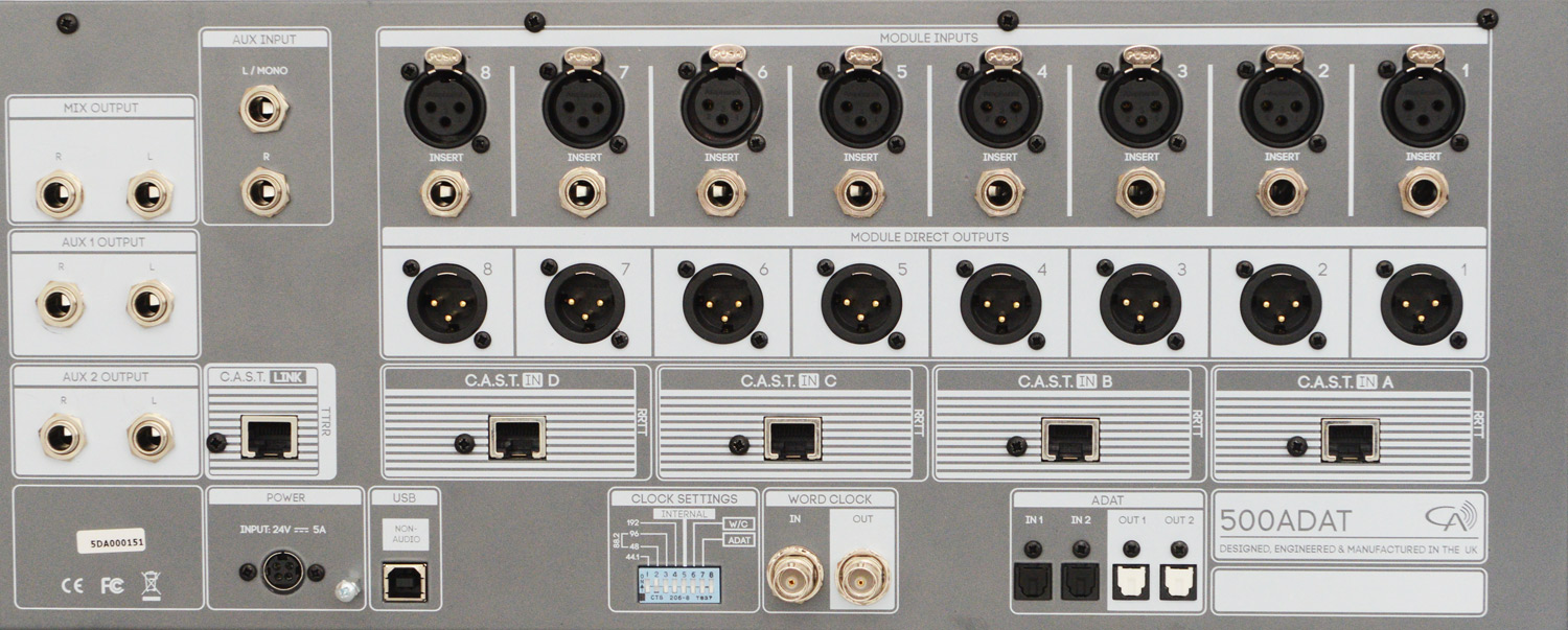 Darüber hinaus gibt es noch vier RJ-45-Buchsen für die Nutzung der C.A.S.T. Interface-Module von Cranborne Audio. C.A.S.T. ist ein Audio-Snake-System basierend auf CAT-5-Kabelverbindungen. Es lassen sich so vier N22-Module anschließen um Audio über C.A.S.T anzubinden. Es liegen immer ein Kanalpaare auf den C.A.S.T.-Buchsen (A ... D) des 500ADAT auf.