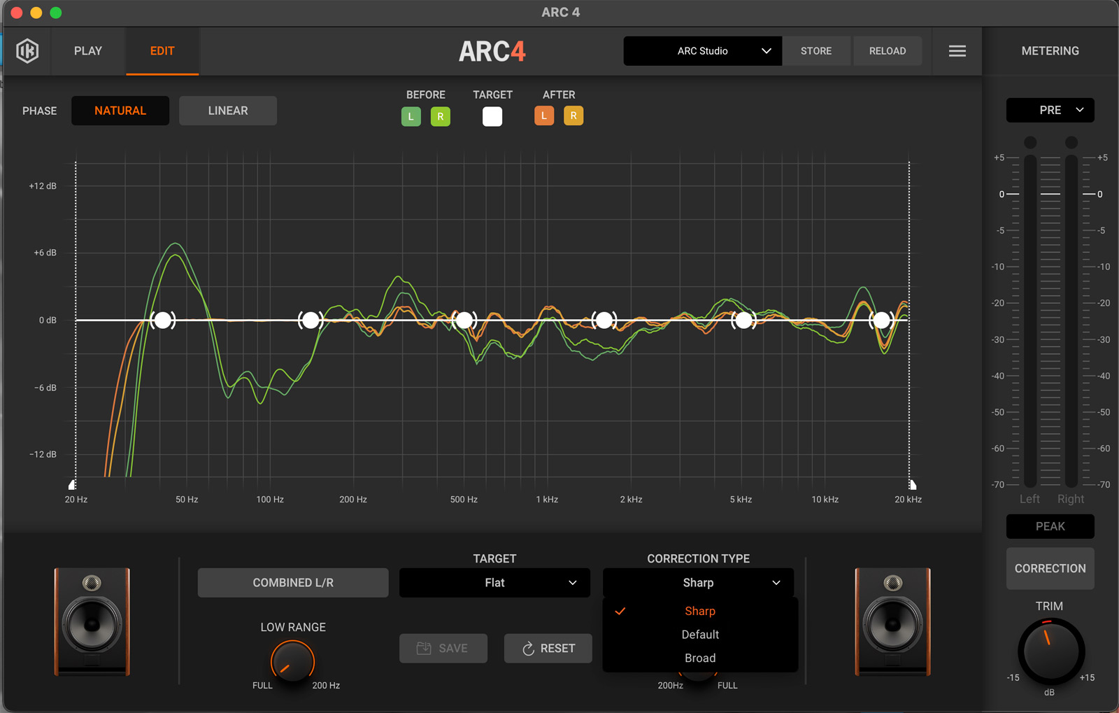 Im Edit-Modus lässt sich die Frequenzkurve außerdem über sechs Bänder anpassen sowie eine spezifische Auswahl über den grundsätzlichen Härtegrad der Korrekturumsetzung zwischen Sharp, Default (mittel) und Broad treffen. Darüber hinaus lässt sich der Bereich unterhalb (Low Range) sowie oberhalb von 200 Hz (High Range) bei Bedarf stufenlos aus der Korrektur ausklammern.