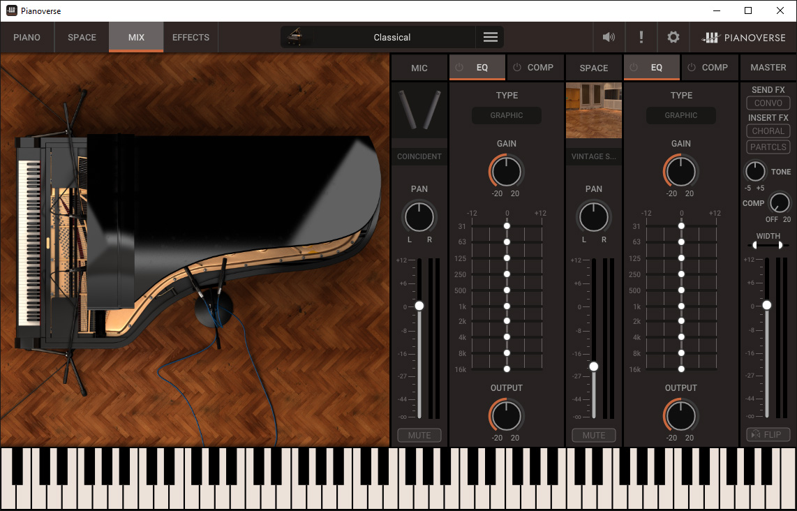 Oben im Kopf werden mehrere Reiter angeboten und zwar PIANO (Instrumenten/Master-Einstellungen), SPACE (Raumsimulation), MIX (Audiobearbeitung) und EFFECTS (Audioeffekte). Wir haben in den Screen-Darstellungen in unserem Test diese mit der Stand-Alone-Software erstellt.