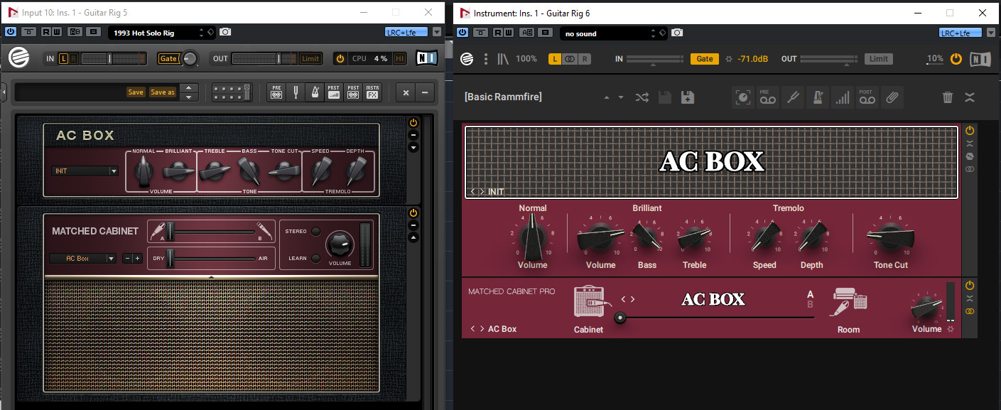 Wenn man sich die ganzen Features von Guitar Rig 6 anschaut und die Infos des Hersteller liest, dann könnte man meinen, dass man an den schon von Guitar Rig 5 Pro vorhandenen Amps, wie der AC BOX (s. Abb. oben), lediglich die Oberfläche aktualisiert hat. Wenn man rein nur die Amps und dazugehörigen Cabinets von Guitar Rig 5 Pro und Guitar Rig 6 Pro vergleicht, wird man aber auch bei gleichen Einstellungen klangliche Unterschiede feststellen, die je nach Amp kleiner oder größer ausfallen - aber sie sind auf jeden Fall da. Der Grund liegt im Wesentlichen in dem neuen Impulse Response Modeling des neuen Cabinet Pro. Der Algorithmus des eingesetzten Faltungshalls ist neu. Daher klingen auch die meisten Presets etwas anders. Es gibt aber auch einige Presets, wie zum Beispiel Pure Rammfire A, die weitgehend identisch klingen.