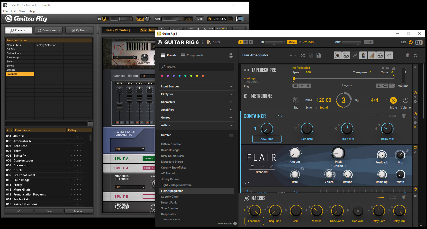 Wenn man die Bedienoberflächen von Guitar Rig 5 Pro und 6 Pro einmal vergleicht (s. Abb. oben links Guitar Rig 5 Pro und rechts 6 Pro) wird man sofort feststellen, dass die grafische Darstellung komplett neu ist und nun deutlich moderner wirkt.