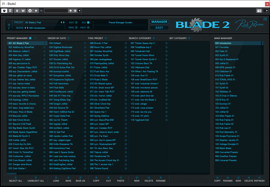 Auf den Preset-Manager möchte ich gar nicht näher eingehen, denn der ist sehr identisch, mit den der anderen Rob Papen Synthesizer und relativ selbsterklärend. Es gibt Bänke mit Presets und man kann über das Stern-Icon auch Favoriten bestimmen. Zudem lässt sich jedes Preset Kategorien zuorndnen und man kann sowohl nach Preset-Namen als auch nach Presets von Kategorie-Kombinationen suchen. Das soll es auch schon mit der Erklärung gewesen sein.