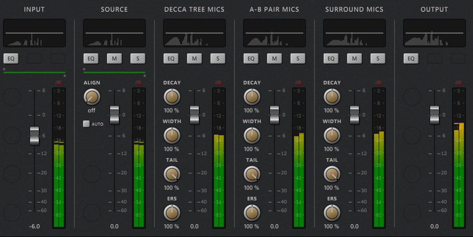 Kanalzügen für Ein- und Ausgang, Quellensignal sowie der drei Mikrofongruppen. Bei der Quelle lässt sich eine Verzögerung manuell einstellen oder beim Anklicken von Auto eben automatisch kompensieren. Bei den drei Mikrofonkanälen kann man neben Early Reflections und Tail-Pegel, die Abklingzeit sowie die Stereobreite relativ auf den Standardwert in Prozent einstellen. Über den Fader lässt sich der Pegelanteil des Mikrofons justieren.