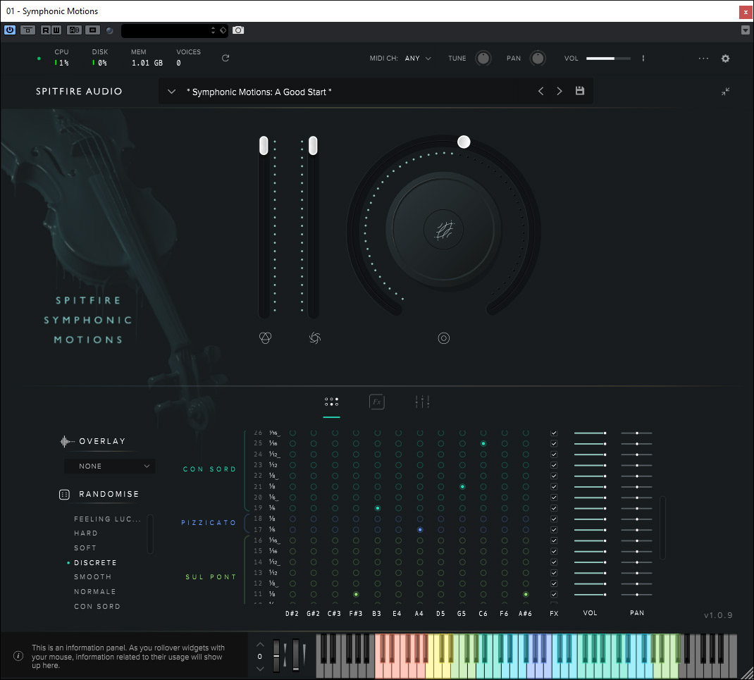 Symphonic Motions ist ein virtuelles Instrument für die Reproduktion von Streichern, welches das Repetieren von Noten ermöglicht und somit auch sehr komplexe, rhythmische Phrasen. Dabei hat man sich unter anderem einem Problem gewidmet, nämlich dass eine einfache wiederholte Wiedergabe von Samples unnatürlich klingt. Das hängt mit der Bewegung des Bogens zusammen und man hat zudem verschiedenen Spielarten wie Pizzicato, Spiccato oder Con Legno etc. berücksichtigt, die die rythmischen Muster noch komplexer klingen lassen. Dazu später mehr.