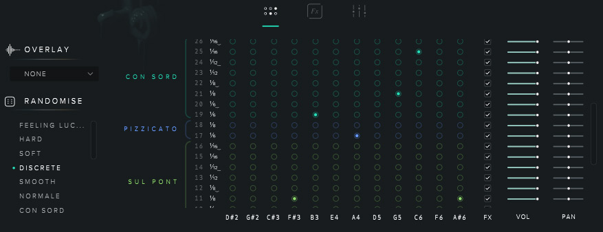 Mit diesem Grid lassen sich Spielweisen (Normal, sul pont - am Steg, Pizzicato - gezupft, con sord - gedämpft, sul tasto - am Griffbrett, col legno - mit dem Bogenholz also umgedrehter Bogen, Ostinato - in dem Fall eine wiederholende Figur aus zwei Tönen) mit verschiedenen Notenlängen (2, 4 oder 8 je nach Spielweise) den Keyboard-Bereich zuweisen, wobei ein Keyboard-Bereich immer fünf Halbtöne umfasst. Wem die manuelle Zuweisung zu mühsam ist kann oder experimentieren will, der kann auch die Zufallsfunktion nutzen, die verschiedene Kategorien bietet. Für jede dieser Zuweisung kann man bestimmen ob die Effektsektion wirken soll und es lässt sich Pegel und Stereopanorama individuell einstellen.