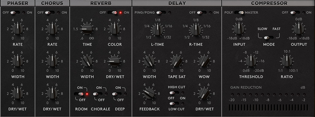 Und auch Effekte sind in dem The Legend HZ direkt integriert wie ein Phaser, Chorus, Hall, Delay mit einstellbarer Bandsättigung und justierbare Tonhöhenschwankung (Wow) sowie einem klassischen Kompressor mit zweistufiger Zeitkonstanten-Einstellung, Einsatzschwellwert und Kompressionsverhältnis sowie einer Gain-Reduction-Bargraf-Anzeige.