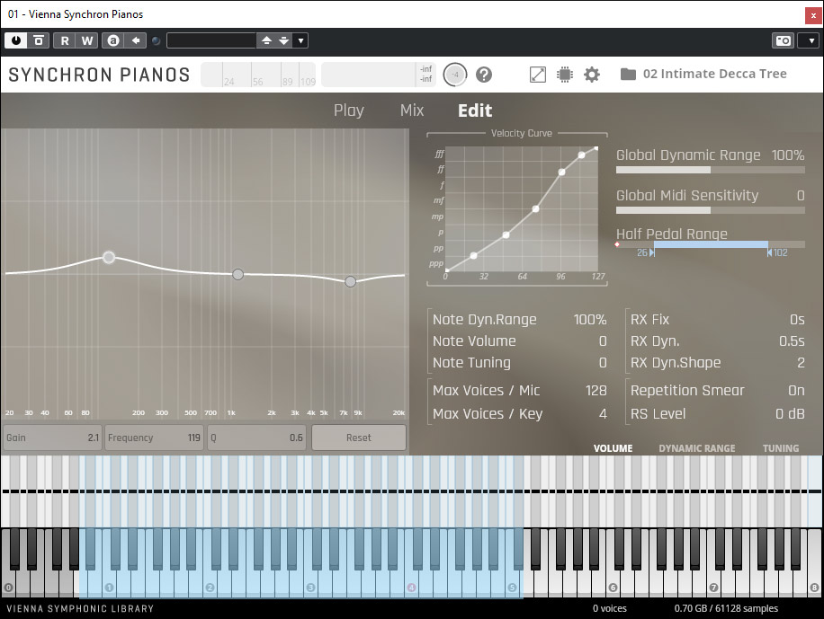Das Laden der Sample-Bibliotheken dauert zum Teil einige Minuten. Man hat es hier eben - was den Datenumfangs angeht - mit einer sehr großen Bibliothek zu tun und da kommen wir auch schon zu den beiden wesentlichen Punkten nämlich Quantität und Qualität der Bibliothek-Samples. Der Dynamikumfang ist wirklich großartig und lässt sich Dank der Velocity-Kurve optimal anpassen. Gerade für Master-Keyboards ohne Hammermechanik oder Wichtung immens von Vorteil bei einem solchen virtuellen Instrument.