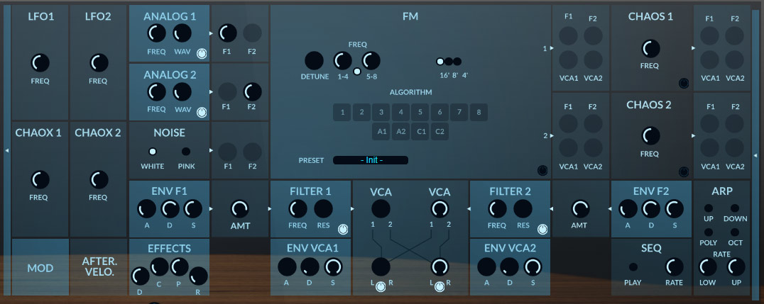 Neben zwei klassischen Oszillatoren nach analogem Vorbild inklusive Rauschgenerator gibt es noch zwei sogenannte "Chaotic Oscillators", die über verschiedene Algorithmen natürliche Klänge generieren sollen, von rauschhaftem über Vokal-artiges, bis hin zur Oberwellengenerierung. Der mit FM bezeichnete Block bietet zwei Bänke mit jeweils vier Oszillatoren. Diese lassen sich als acht FM-Operatoren oder eben in zwei Gruppen für einen Stereo-Sound nutzen. Dahinter folgen im Stereopfad zwei Filter und zwei virtuelle VCAs, die jeweils von Hüllkurvengeneratoren angesteuert werden.