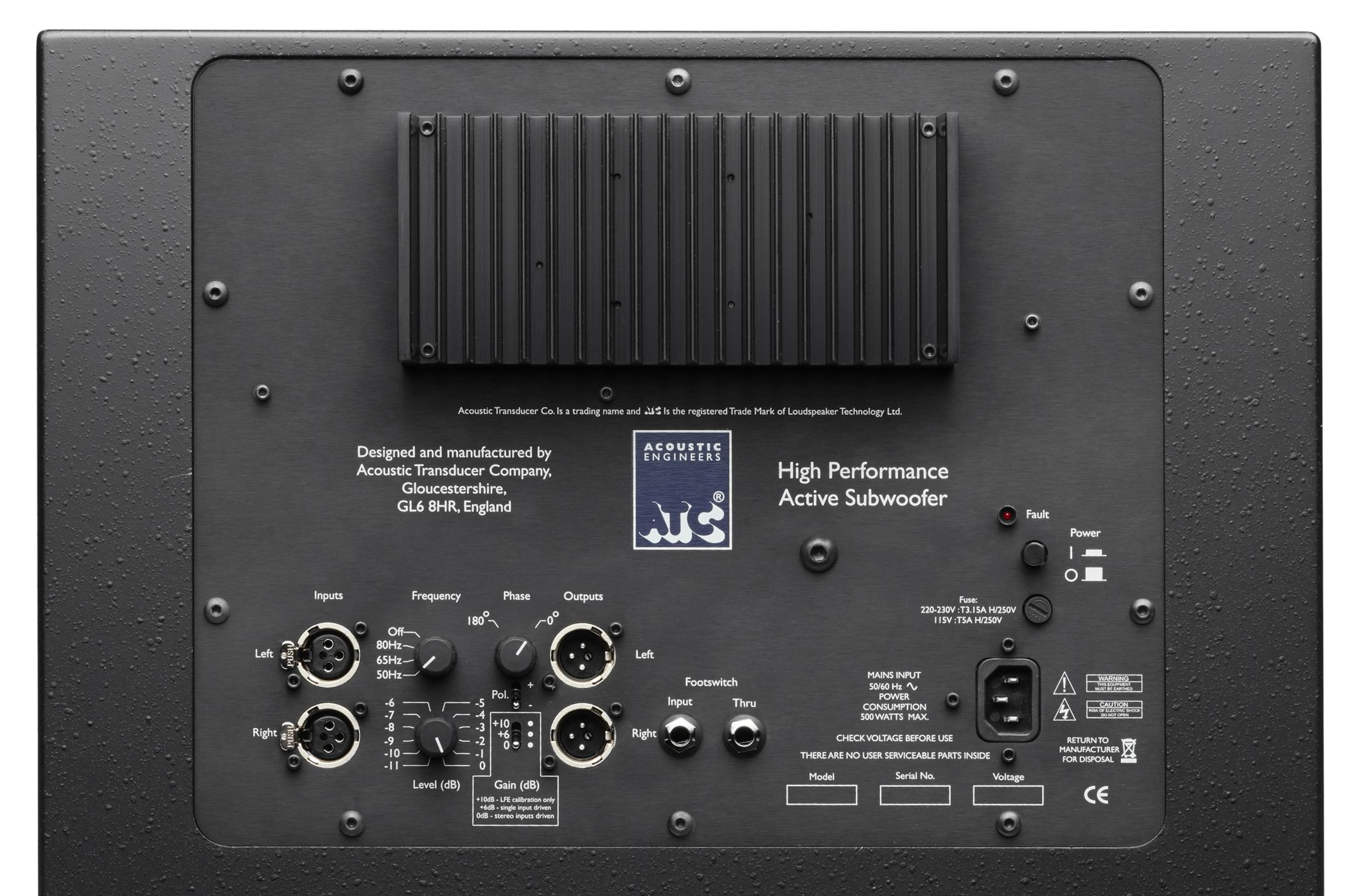 Duly drawing upon 34 years of experience in amplifier design and development, the SCS70 Pro’s driver is partnered with a new 300W Class AB power amplifier, hand built by ATC at its UK facility and optimised to the requirements of the drive unit to deliver fast, dynamic bass with minimal colouration. The two balanced Inputs provide connectivity for use in both stereo and multi-channel/immersive audio systems while two buffered balanced Outputs provide connection to monitor loudspeakers and/or to ‘daisy-chain’ multiple subs. The 4th order Linkwitz-Riley low-pass filters involved in the power amplifier’s crossover are analogue, and filter Frequency options ensure optimal integration with a wide range of studio monitors, including ATC’s own critically-acclaimed range, with an industry-standard 80Hz low-pass and an Off option (for use with external processing) provided. Additionally, a Pol. (Polarity) switch plus a continuously variable - 180° through to 0° - Phase adjustment allows for further subwoofer crossover optimisation and a stepped attenuator with a 21dB range provides precise level matching.