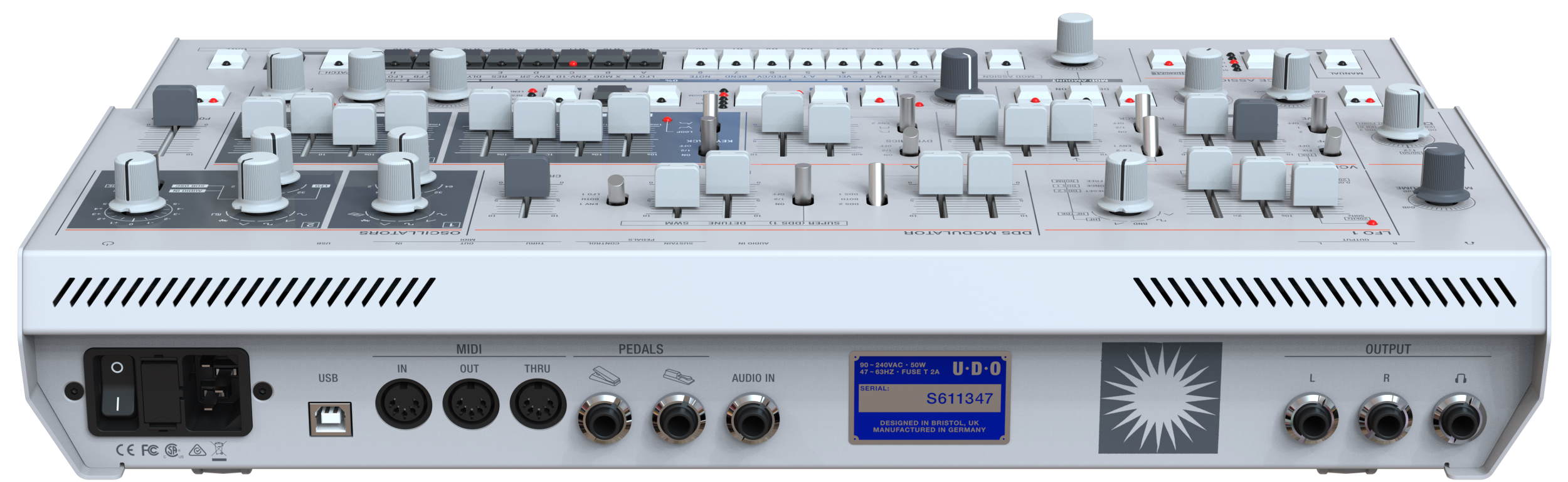 Clear-cut form factor differences notwithstanding, the rear panel-positioned running order of the Super 6 Desktop’s I/O connectivity is identical to that of its Super 6 sibling, starting with USB I/O for MIDI, plus patch, sequence, and waveform management (via simple USB ‘memory stick’ type interface with no extra drivers or applications required), as well as easy OS upgrade; MIDI IN, OUT, and THRU on DIN connectors; self-explanatory CONTROL and SUSTAIN PEDALS inputs; AUDIO IN for stereo 1⁄4” jack - allowing users to process an external audio signal through the synthesizer’s signal path and threshold-based envelope and LFO triggering; main R and L outputs for unbalanced 1⁄4” jacks; and a high-quality stereo headphone power amplifier output.