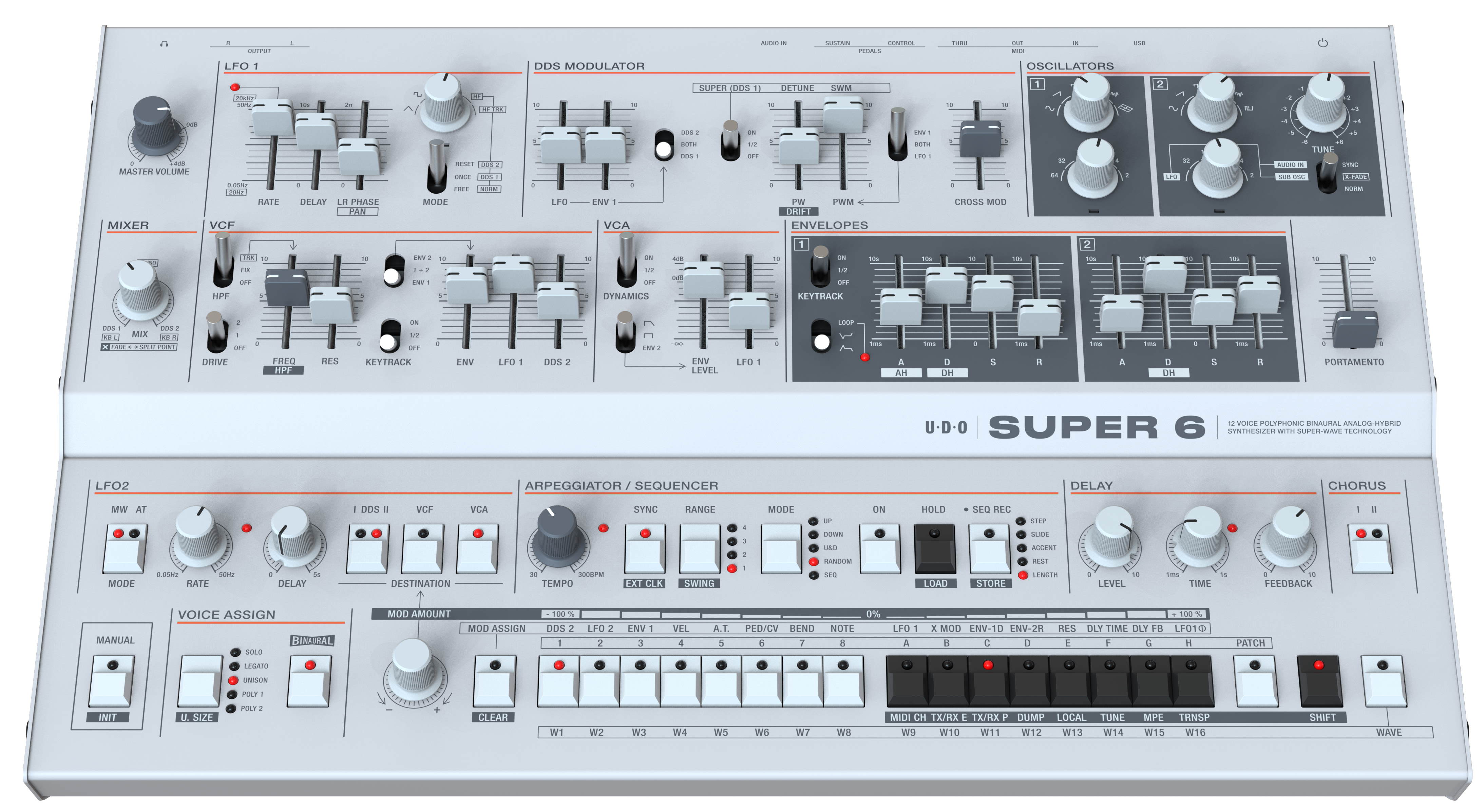 Of course, those already superlative Super 6 features - themselves truly representing a new take on the traditional analog synthesizer - are also included in the Super 6 Desktop: superior build quality and intuitive hands-on control for expressive performances with no menus or menu-diving distractions; state-of-the-art FPGA-based oscillators featuring DDS (Direct Digital Synthesis) and downloadable waveforms, with DDS 1 (oscillator 1) being an FPGA-based super-wave oscillator core sampled at 50MHz with a centroid oscillator and six sister oscillators that can be dynamically de-phased in the stereo field - hence highlighted in that BINAURAL and SUPER-WAVE wording; real analog VCF, reprising the SSM2044 of legacy chipmaker Solid State Micro Technology (believed by many to be the best-sounding analog synthesis IC ever produced), VCA, and modulators; loop-able ENVELOPES, LFOs, and modulators with audio rate modulation; MIDI-syncable, multi-mode ARPEGGIATOR / SEQUENCER - straightforward in use; dual-mode stereo CHORUS and syncable and modulate-able stereo DELAY - both with 24-bit/192kHz processing... all are but the ‘edited highlights’ of both instruments’ impressive specification.