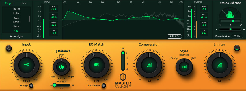The result can be seen in the plug-in in the form of a curve (gain correction at the various frequencies). MASTER MATCH X can then be used to set the spectral balance (bass/treble) and degree of adjustment (EQ match). There is also a compressor. The degree of compression and one of three compression types can be set here, and a downstream limiter with the option of setting the limiter input level is also provided.