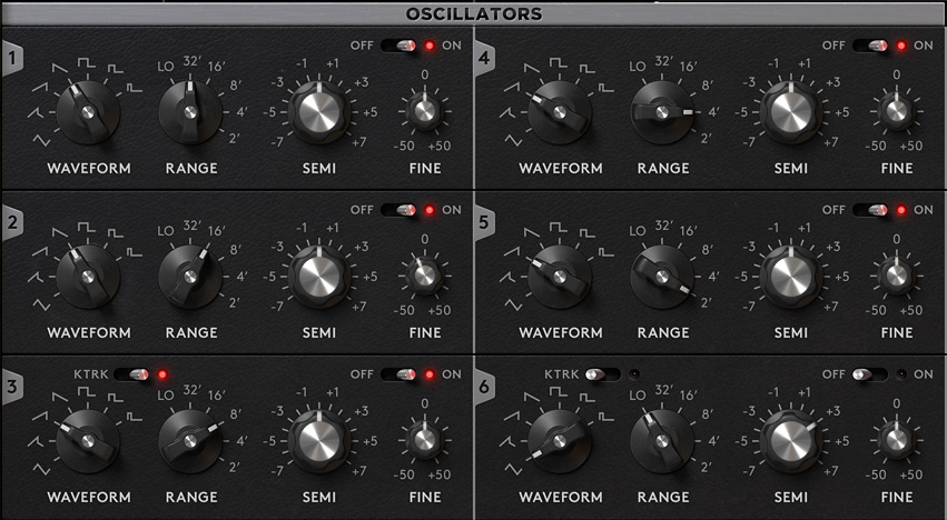 We now arrive at a significant difference from the original design. On the left, everything still looks original; however, instead of three, The Legend HZ version now fortunately has six oscillators. Therefore, oscillators 1 to 3 are functionally present twice. Keyboard tracking can be switched off for oscillators 3 and 6. Compared to the original, "Sharktooth" has been added to the waveforms - a mixture of sawtooth for the rising, and a triangle waveform for the falling waveform.
